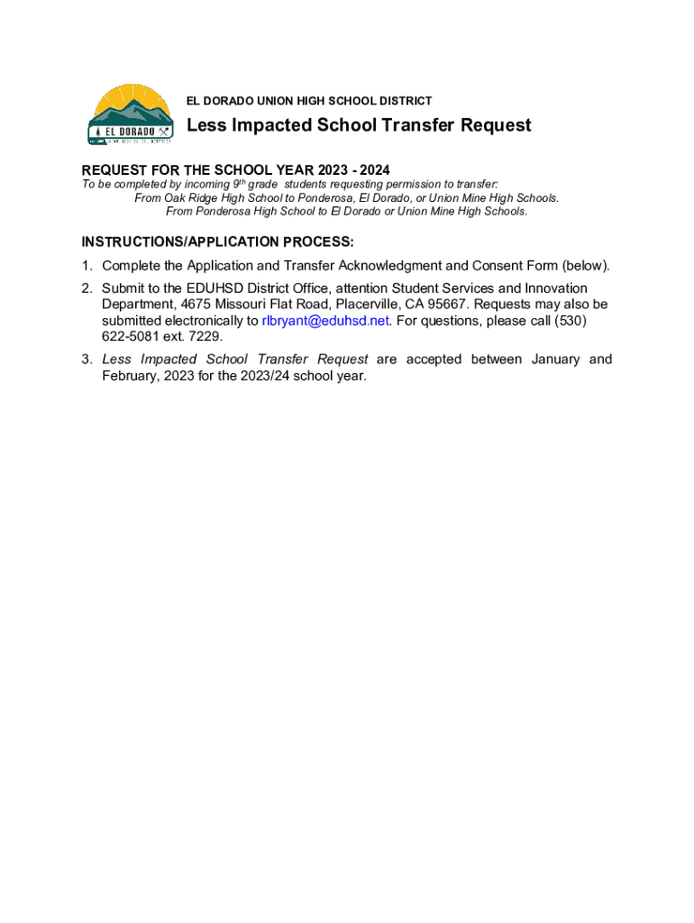 EL DORADO UNION HIGH SCHOOL Districts Impacted School Transfer Request FOR THE SCHOOL YEAR 2023 2024To be completed by incoming 9th grade students requesting permission to transfer: From Oak Ridge