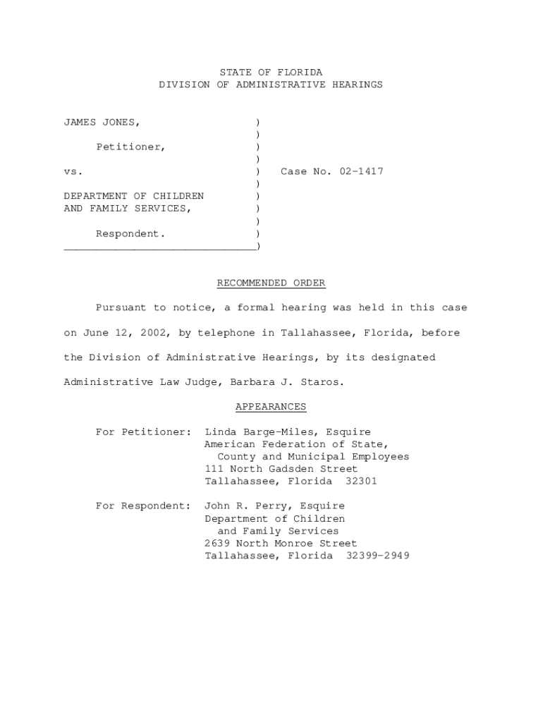 STATE OF FLORIDA DIVISION OF ADMINISTRATIVE HEARINGSJAMES JONES, ) ) Petitioner,) ) vs.) ) DEPARTMENT OF CHILDREN) AND FAMILY SERVICES,) ) Respondent. ) ___)Case No. 021417RECOMMENDED ORDER Pursuant