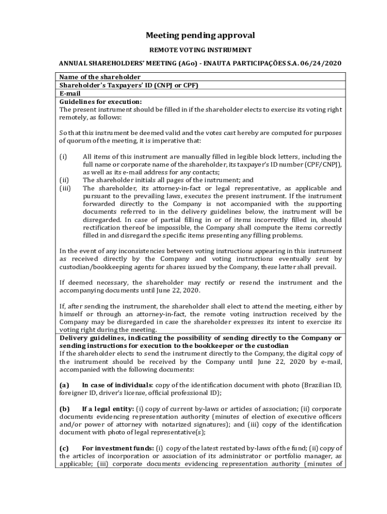 Meeting pending approval REMOTE VOTING INSTRUMENT ANNUAL SHAREHOLDERS MEETING (Ago) ENACT PARTICIPATES S.A. 06/24/2020 Name of the shareholder\'s Taxpayers\' ID (CNJ or CPF) Email Guidelines for execution: