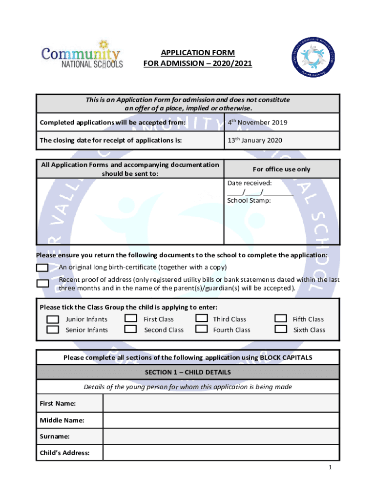 APPLICATION FORM FOR ADMISSION 2020/2021This is an Application Form for admission and does not constitute an offer of a place, implied or otherwise. Completed applications will be accepted from:4th