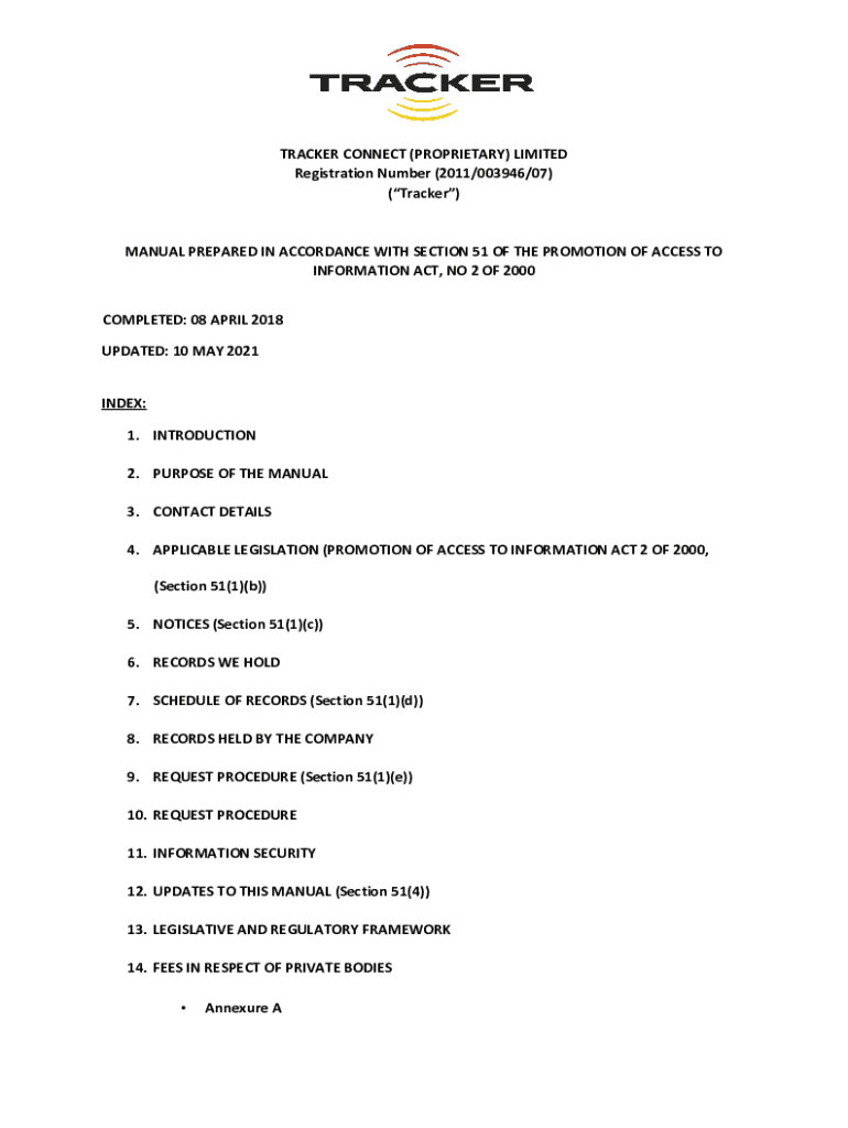 TRACKER CONNECT (PROPRIETARY) LIMITED Registration Number (2011/003946/07) (Tracker)MANUAL PREPARED IN ACCORDANCE WITH SECTION 51 OF THE PROMOTION OF ACCESS TO INFORMATION ACT, NO 2 OF 2000 COMPLETED: