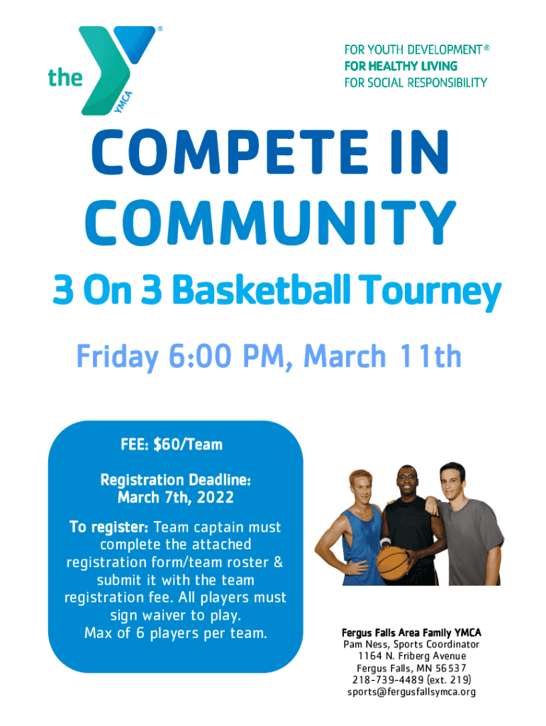COMPETE IN COMMUNITY 3 On 3 Basketball Tourney Friday 6:00 PM, March 11th FEE: $60/Team Registration Deadline: March 7th, 2022 To register: Team captain must complete the attached registration form/team