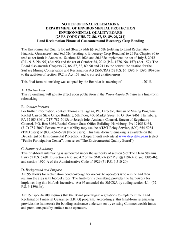 NOTICE OF FINAL REMAKING DEPARTMENT OF ENVIRONMENTAL PROTECTION ENVIRONMENTAL QUALITY BOARD [25 PA CODE CHS. 77, 86, 87, 88, 89, 90, 211] Land Reclamation Financial Guarantees and Bioenergy Crop Bonding