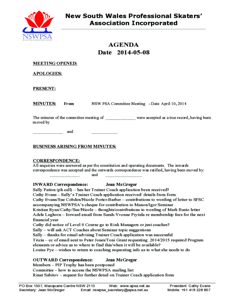 New South Wales Professional Skaters Association IncorporatedAGENDA Date 20140508 MEETING OPENED: APOLOGIES: PRESENT: MINUTES:From NSW PSA Committee Meeting Date April 10, 2014The minutes of the committee