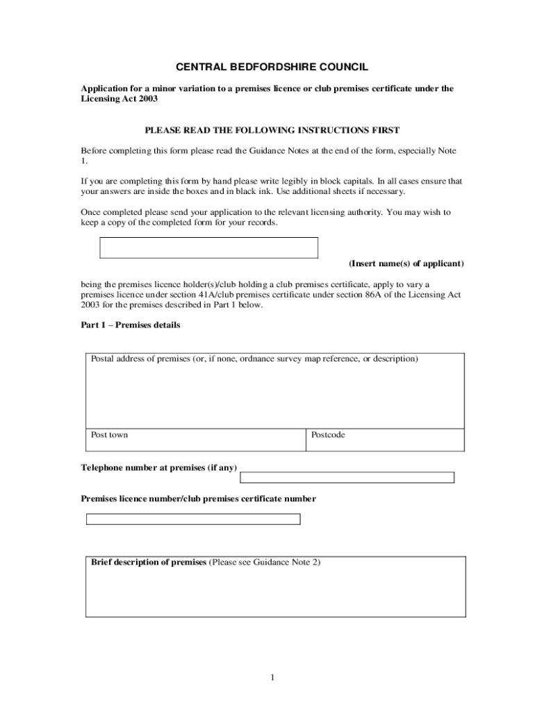 CENTRAL BEDFORDSHIRE COUNCIL Application for a minor variation to a premises license or club premises certificate under the Licensing Act 2003PLEASE READ THE FOLLOWING INSTRUCTIONS FIRST Before completing