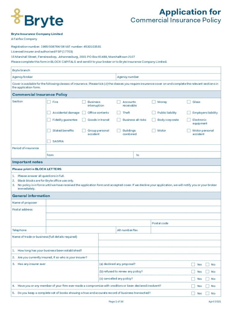 Application noncommercial Insurance Policy Byte Insurance Company Limited A Fairfax Company Registration number: 1965/006764/06 VAT number: 4530103581 Licensed insurer and authorized FSP (17703) 15