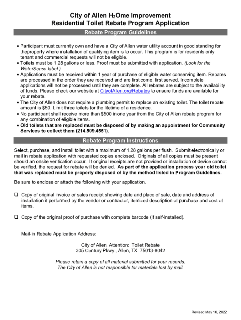 City of Allen H2Ome Improvement Residential Toilet Rebate Program Application Rebate Program Guidelines Participant must currently own and have a City of Allen water utility account in good standing
