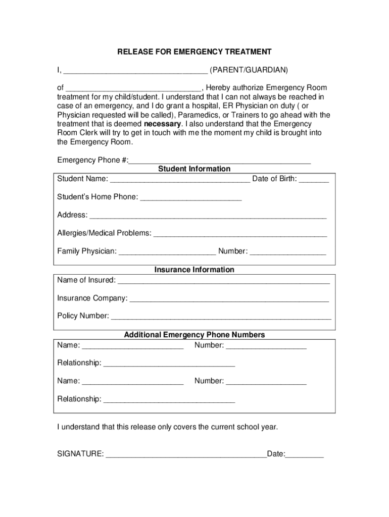 RELEASE FOR EMERGENCY TREATMENT I, ___ (PARENT/GUARDIAN) of ___, Hereby authorize Emergency Room treatment for my child/student. I understand that I can not always be reached in case of an emergency,