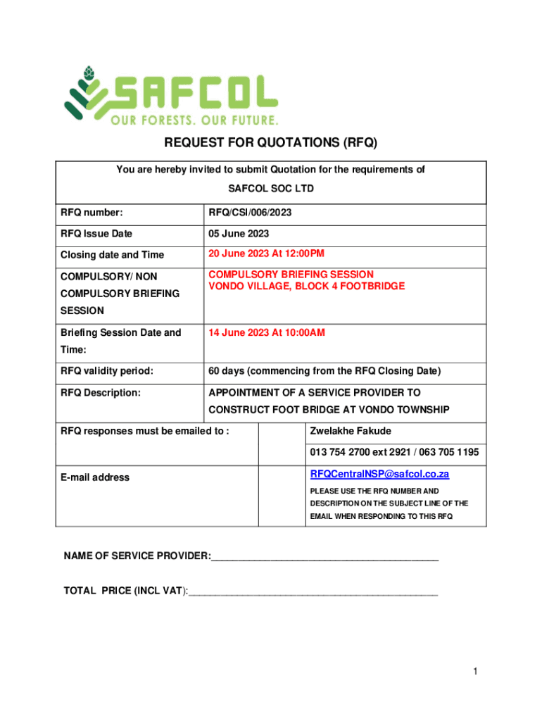 REQUEST FOR QUOTATIONS (RFQ) You are hereby invited to submit Quotation for the requirements of SAF COL SOC LTD RFQ number:RFQ/CSI/006/2023RFQ Issue Date05 June 2023Closing date and Time20 June 2023