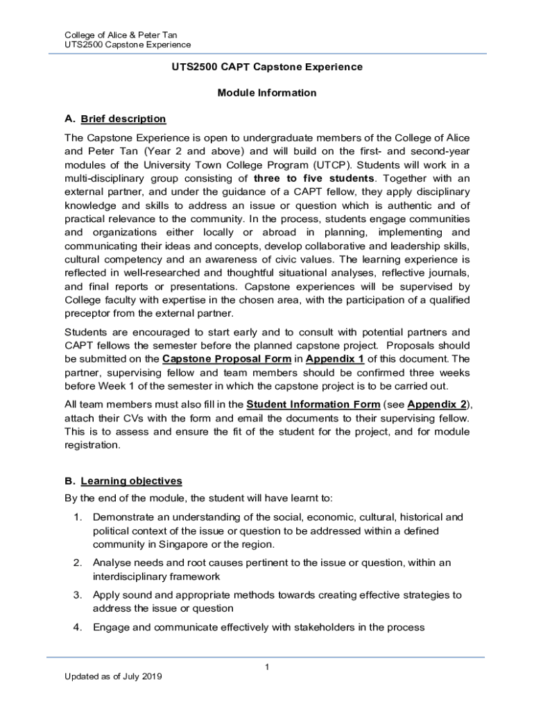 College of Alice & Peter Tan UTS2500 Capstone ExperienceUTS2500 CAPT Capstone Experience Module Information A. Brief description The Capstone Experience is open to undergraduate members of the College