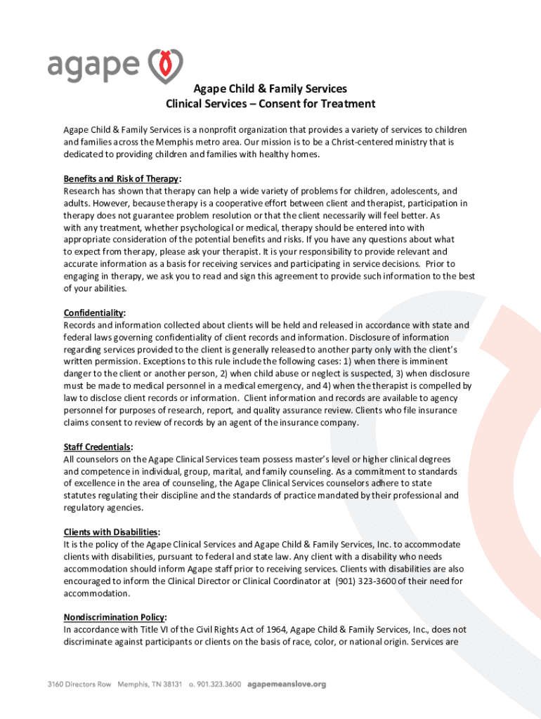 Agape Child & Family Services Clinical Services Consent for Treatment Agape Child & Family Services is a nonprofit organization that provides a variety of services to children and families across