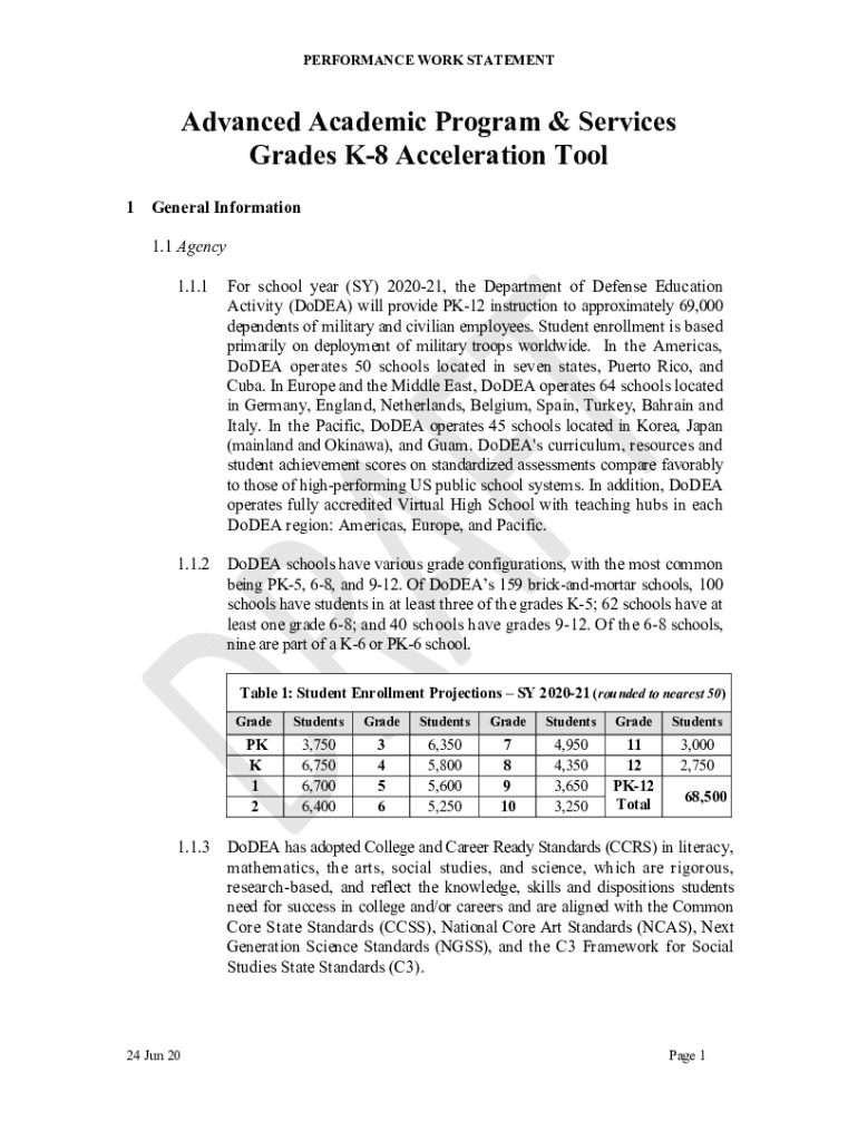 PERFORMANCE WORK STATEMENTAdvanced Academic Program & Services Grades K8 Acceleration Tool 1General Information 1.1 Agency 1.1.1For school year (SY) 202021, the Department of Defense Education Activity