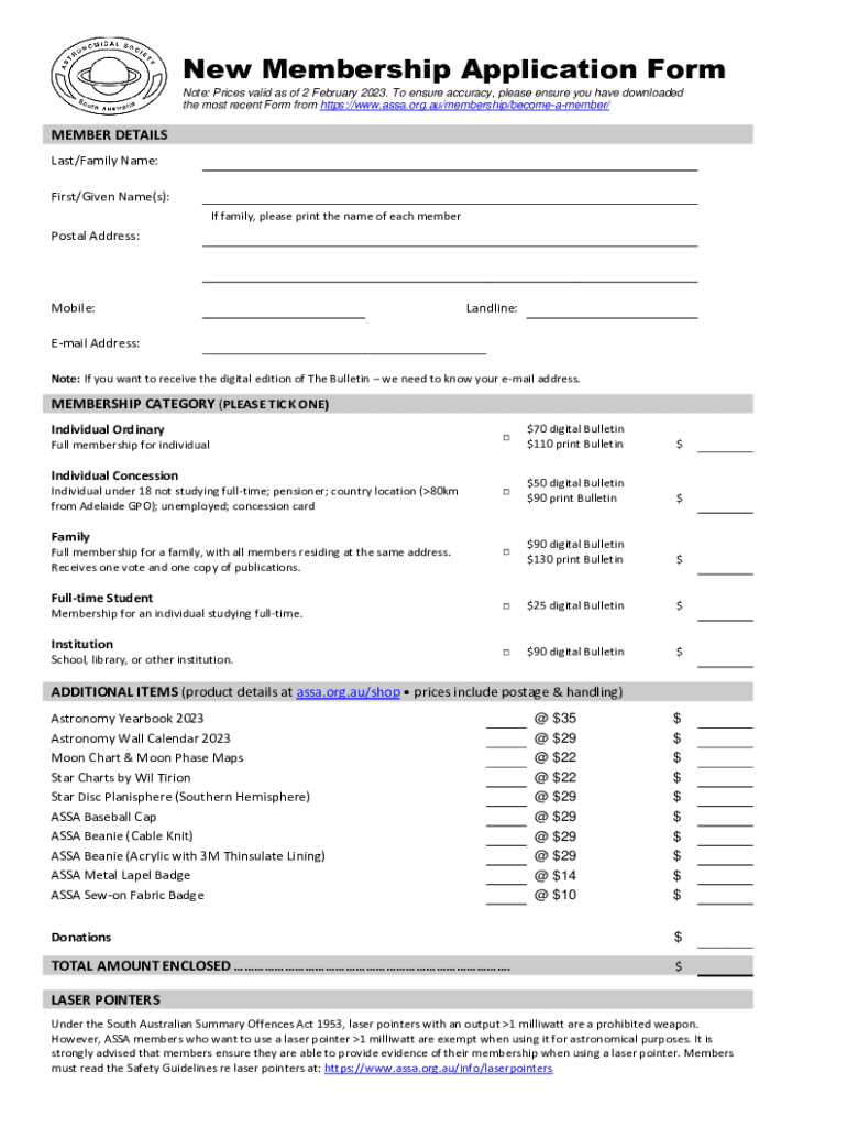 New Membership Application Form Note: Prices valid as of 2 February 2023. To ensure accuracy, please ensure you have downloaded the most recent Form from https://www.assa.org.au/membership/becomeamember/MEMBER