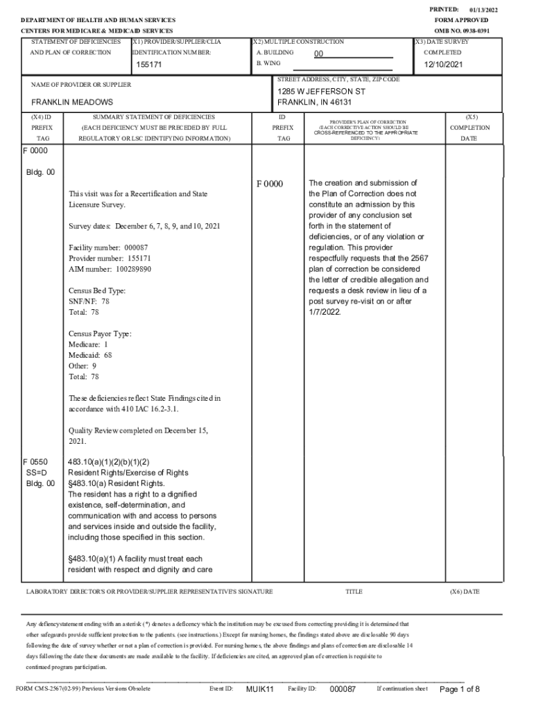 PRINTED: DEPARTMENT OF HEALTH AND HUMAN SERVICES CENTERS FOR MEDICARE & MEDICAID SERVICES STATEMENT OF DEFICIENCIES(X1) PROVIDER/SUPPLIER/LIGAND PLAN OF CORRECTIONIDENTIFICATION NUMBER:15517101/13/2022FORM