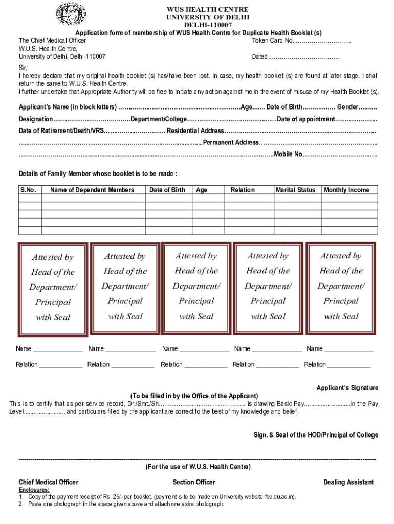 WAS HEALTH Center UNIVERSITY OF DELHI DELHI110007 Application form m of membership of WAS Health Center for Duplicate Health Booklet (s) The Chief Medical Officer Token Card No. . W.U.S. Health Center,