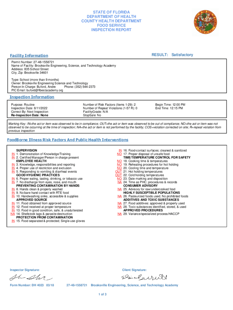 STATE OF FLORIDA DEPARTMENT OF HEALTH COUNTY HEALTH DEPARTMENT FOOD SERVICE INSPECTION REPORTRESULT: SatisfactoryFacility Information Permit Number: 27481558721 Name of Facility: Brookville Engineering,