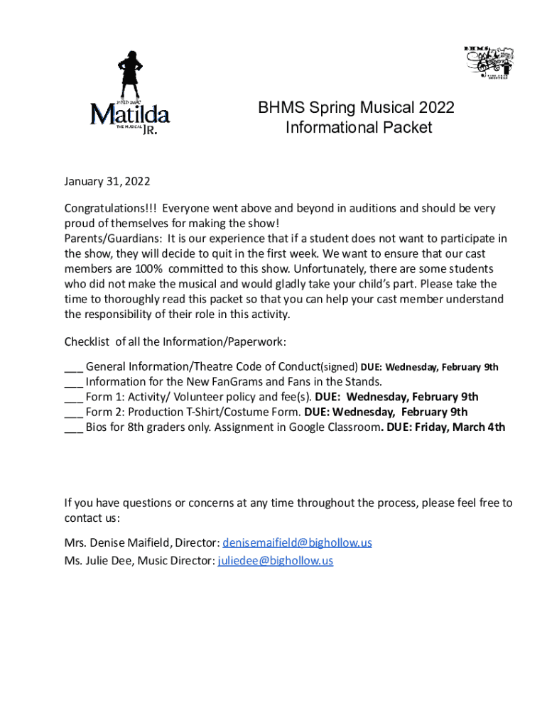 BMS Spring Musical 2022 Informational Packet January 31, 2022, Congratulations!!! Everyone went above and beyond in auditions and should be very proud of themselves for making the show! Parents/Guardians: