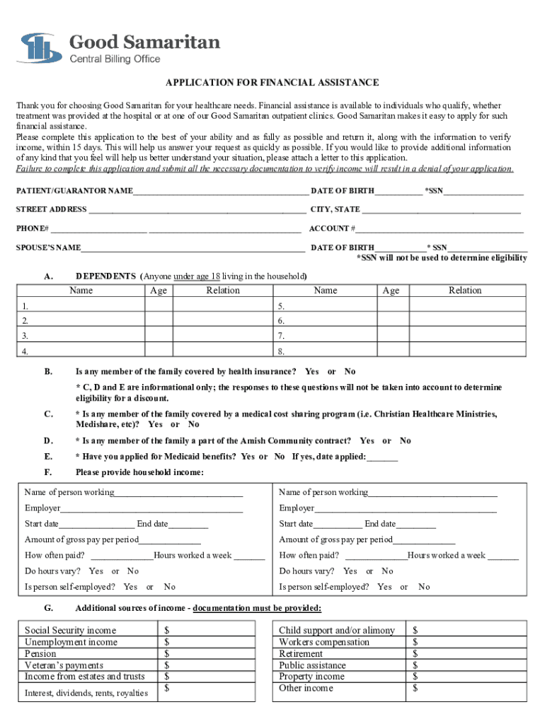 APPLICATION FOR FINANCIAL ASSISTANCE Thank you for choosing Good Samaritan for your healthcare needs. Financial assistance is available to individuals who qualify, whether treatment was provided at