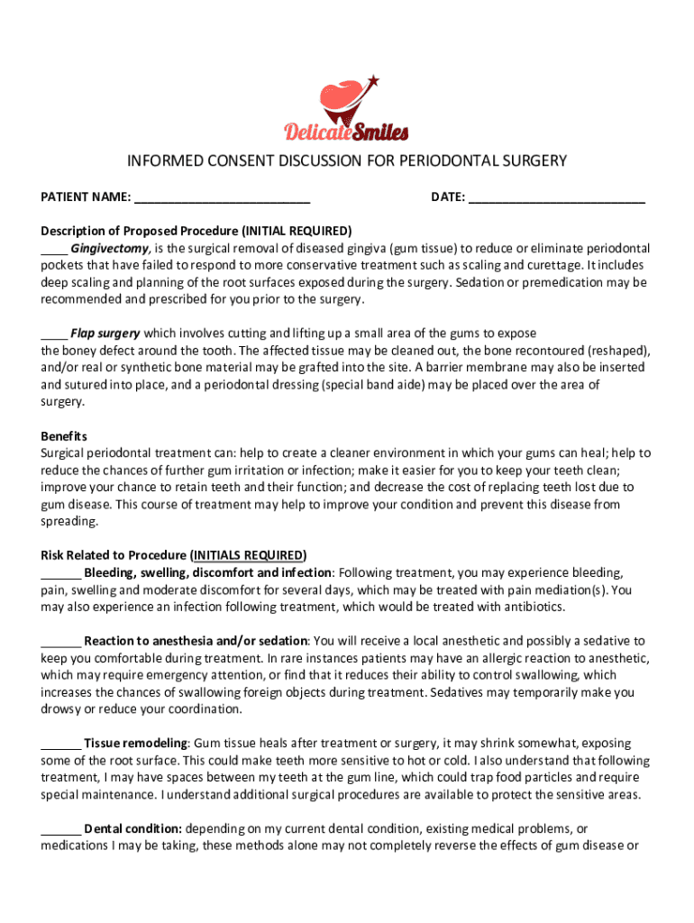 INFORMED CONSENT DISCUSSION FOR PERIODONTAL SURGERY PATIENT NAME: ___DATE: ___Description of Proposed Procedure (INITIAL REQUIRED) ___ Gingivectomy, is the surgical removal of diseased gingival (gum