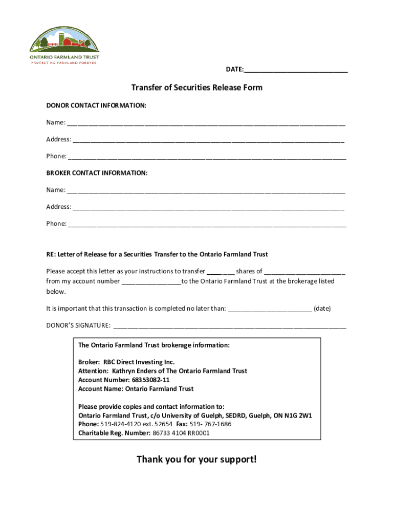 DATE: ___Transfer of Securities Release Form DONOR CONTACT INFORMATION: Name: ___ Address: ___ Phone: ___ BROKER CONTACT INFORMATION: Name: ___ Address: ___ Phone: ___RE: Letter of Release for a Securities