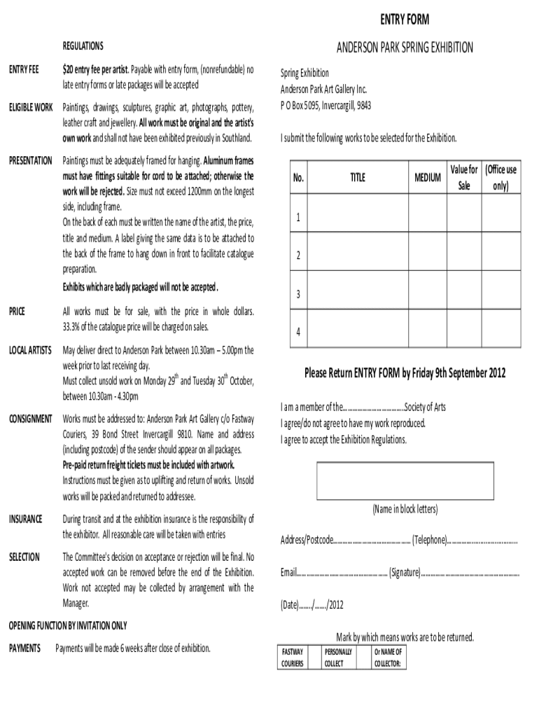 ENTRY FORM ANDERSON PARK SPRING EXHIBITIONREGULATIONS ENTRY FEE$20 entry fee per artist. Payable with entry form, (nonrefundable) no late entry forms or late packages will be acceptedELIGIBLE WORKPaintings,