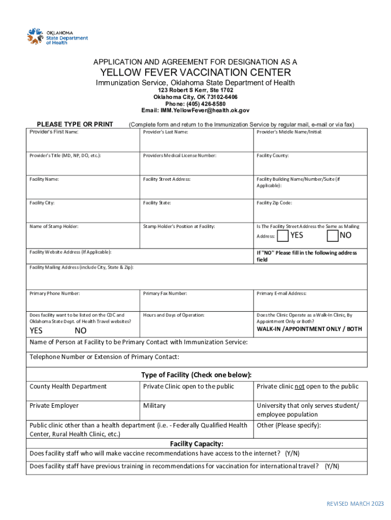 APPLICATION AND AGREEMENT FOR DESIGNATION AS YELLOW FEVER VACCINATION CENTERImmunization Service, Oklahoma State Department of Health 123 Robert S Kerr, Ste 1702 Oklahoma City, OK 731026406 Phone: