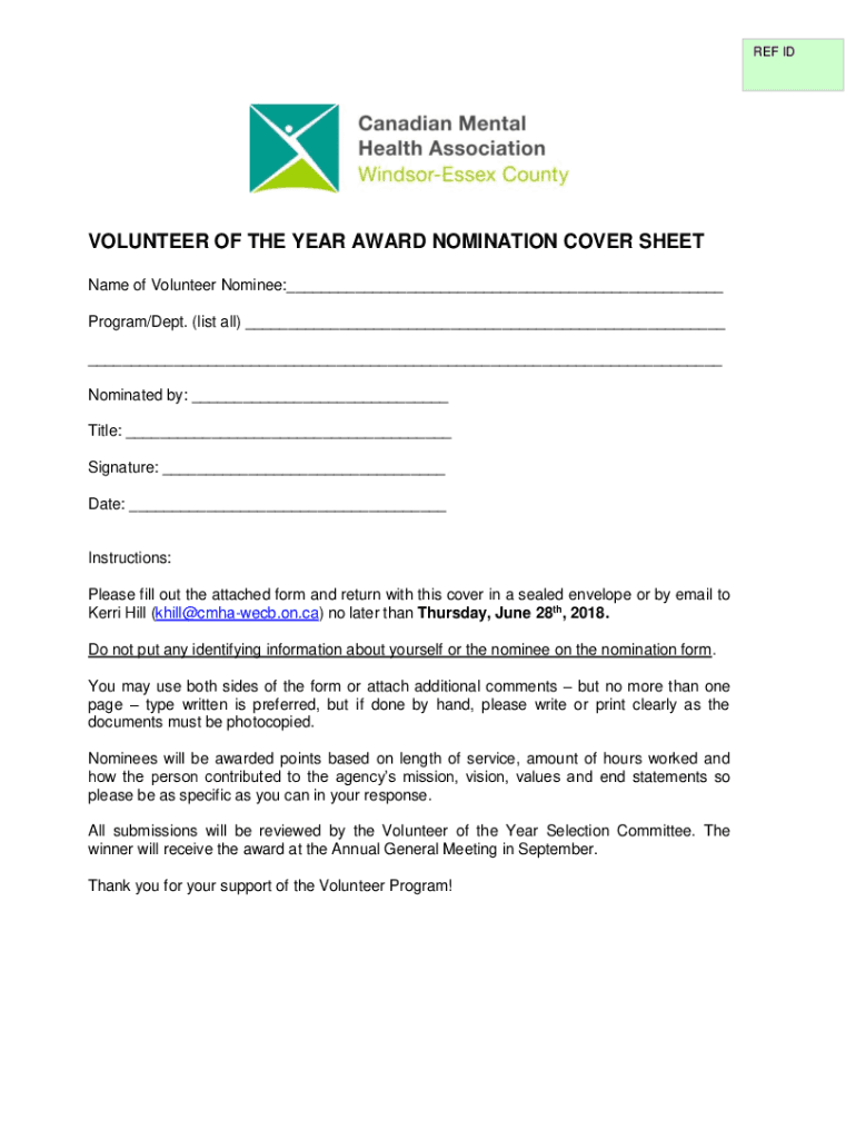 REF VOLUNTEER OF THE YEAR AWARD NOMINATION COVER SHEET Name of Volunteer Nominee:___ Program/Dept. (list all) ___ ___ Nominated by: ___ Title: ___ Signature: ___ Date: ___Instructions: Please fill