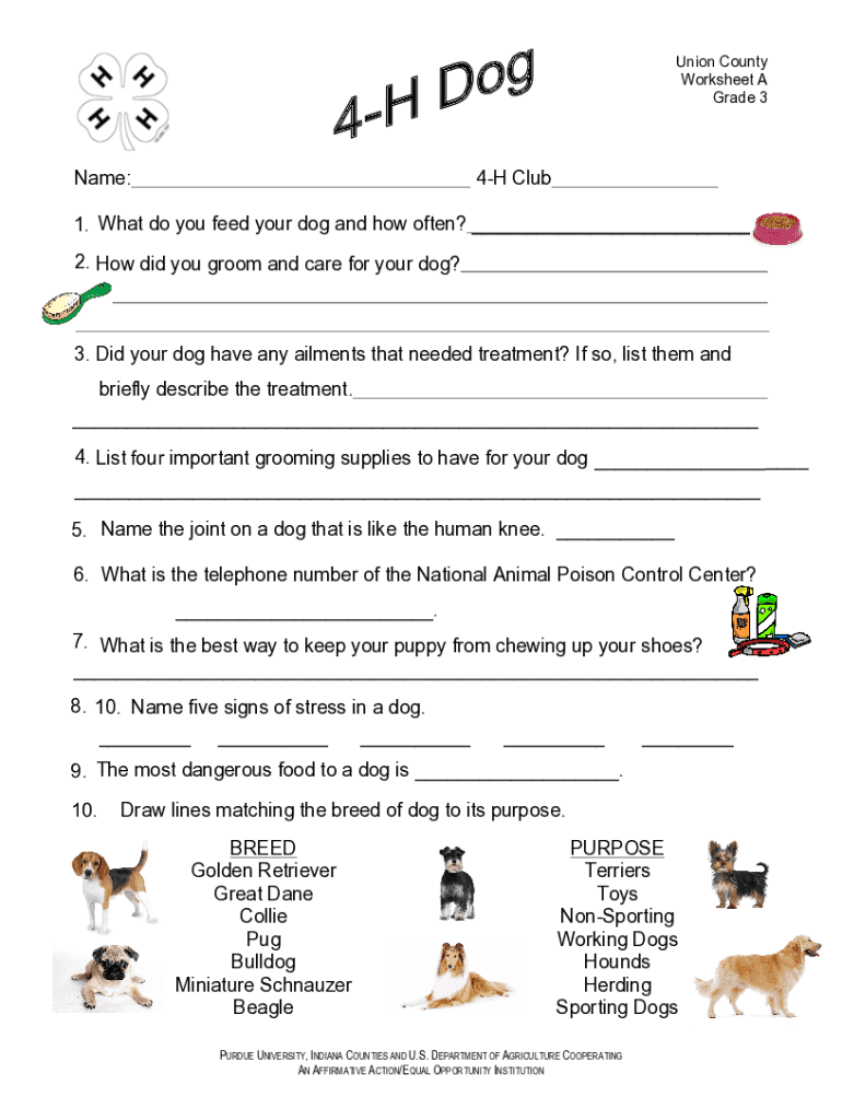 Union County Worksheet A Grade 3Name:4H Club1. What do you feed your dog and how often? ___ 2. How did you groom and care for your dog?3. Did your dog have any ailments that needed treatment? If so,