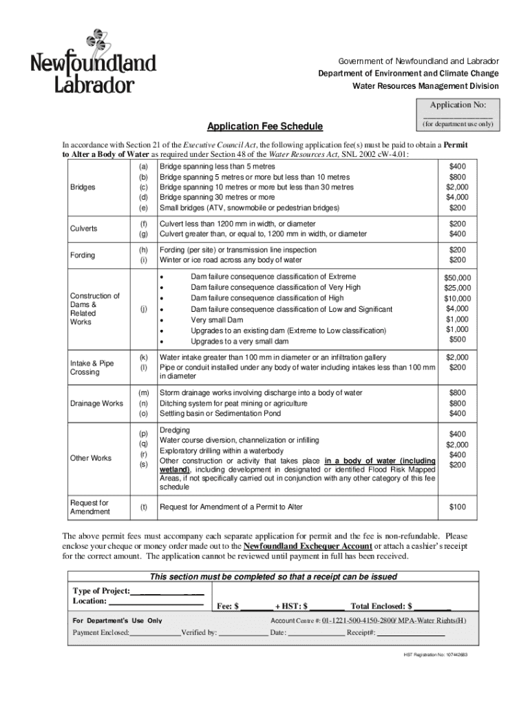 Government of Newfoundland and Labrador Department of Environment and Climate Change Water Resources Management Division Application No: ___ (for department use only)Application Fee Schedule In accordance