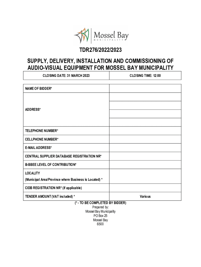 TDR276/2022/2023 SUPPLY, DELIVERY, INSTALLATION AND COMMISSIONING OF AUDIOVISUAL EQUIPMENT FOR MOSSES BAY MUNICIPALITY CLOSING DATE: 31 MARCH 2023CLOSING TIME: 12:00NAME OF BIDDER×ADDRESS×TELEPHONE