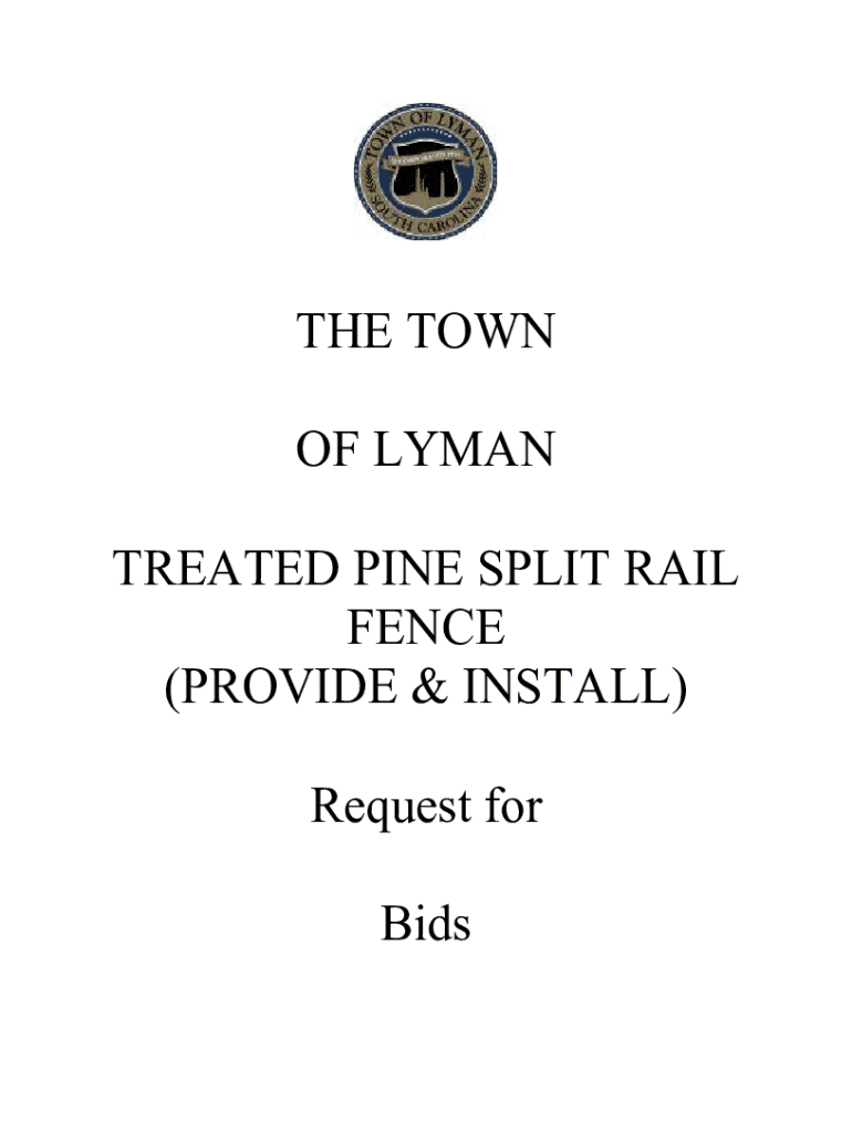 THE TOWN OF LYMAN TREATED PINE SPLIT RAIL FENCE (PROVIDE & INSTALL) Request for BidsNotice to Bidders: Sealed proposals will be received at the Town of Lyman 81 Grace Road Lyman, SC from experienced,