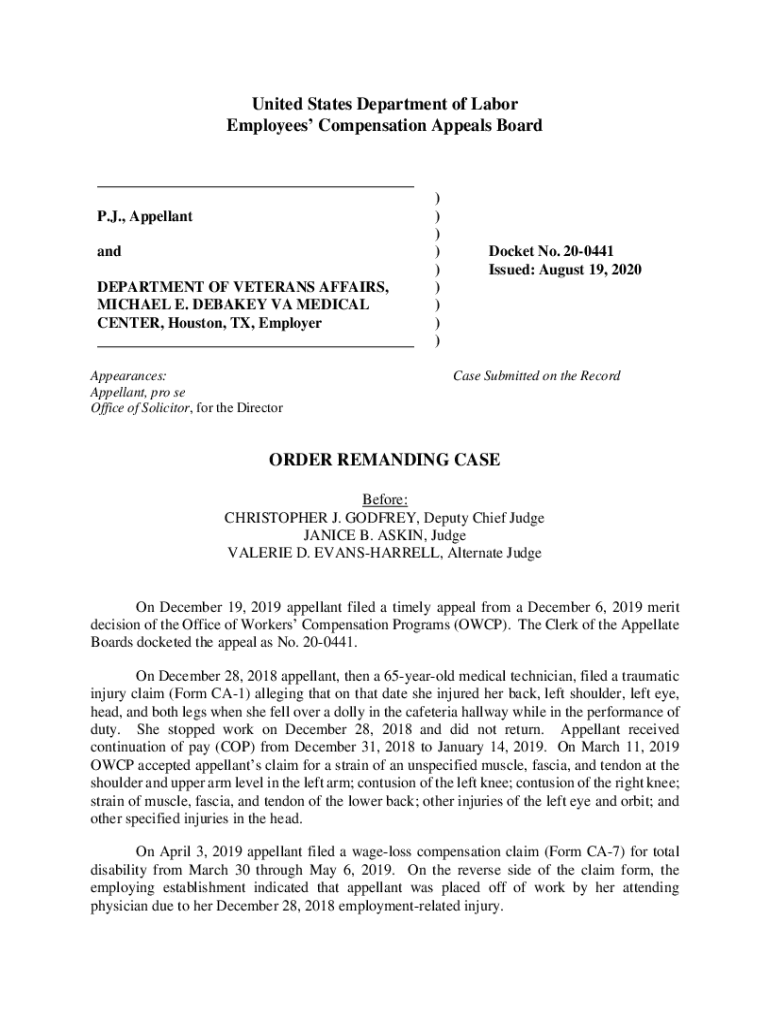 United States Department of Labor Employees Compensation Appeals Board ___ P.J., Appellant and DEPARTMENT OF VETERANS AFFAIRS, MICHAEL E. DEBATE VA MEDICAL CENTER, Houston, TX, Employer ___ Appearances: