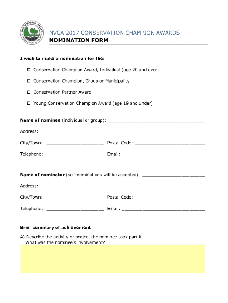 NVCA 2017 CONSERVATION CHAMPION AWARDS NOMINATION GUIDELINESEach year, the Nottawasaga Valley Conservation Authority presents Conservation Champion Awards to individuals, community groups, municipalities,
