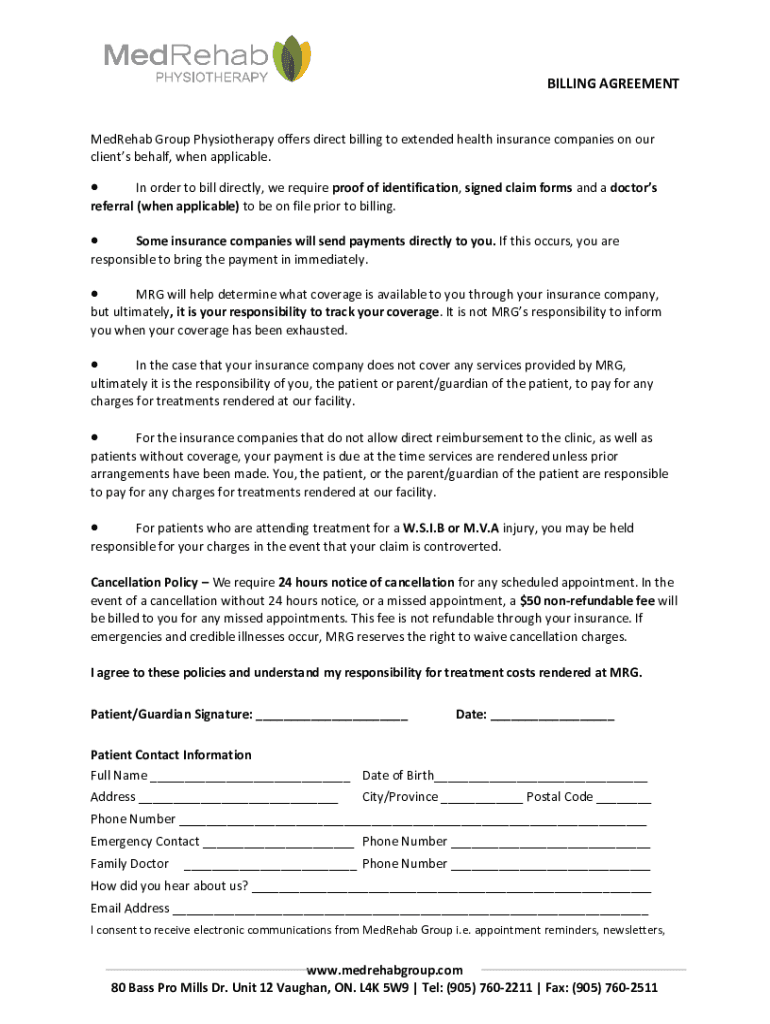 BILLING AGREEMENTMedRehab Group Physiotherapy offers direct billing to extended health insurance companies on our clients behalf, when applicable. In order to bill directly, we require proof of identification,