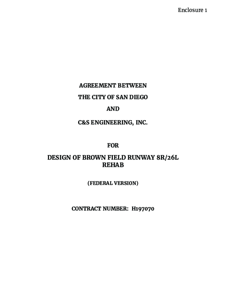 Enclosure 1AGREEMENT BETWEEN THE CITY OF SAN DIEGO AND C&S ENGINEERING, INC.FOREIGN OF BROWN FIELD RUNWAY 8R/26L REHAB (FEDERAL VERSION)CONTRACT NUMBER: H197070TABLE OF CONTENTS ARTICLE I DESIGN PROFESSIONAL