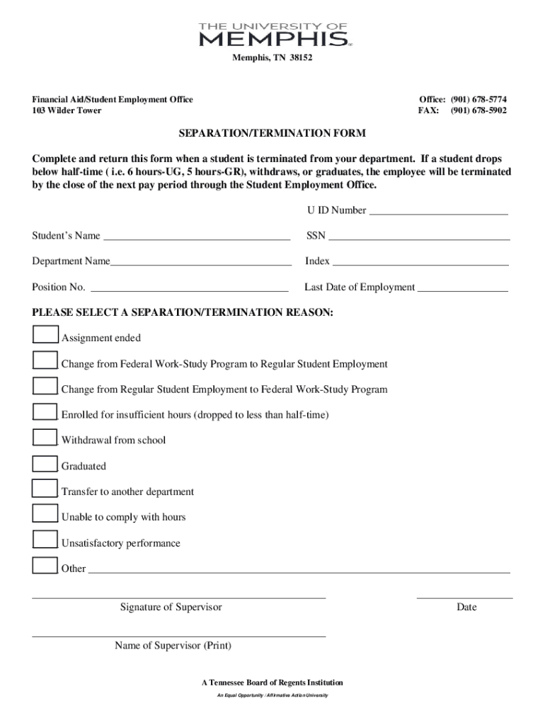 Memphis, TN 38152Financial Aid/Student Employment Office 103 Wilder OpenOffice: (901) 6785774 FAX: (901) 6785902SEPARATION/TERMINATION FORM Complete and return this form when a student is terminated