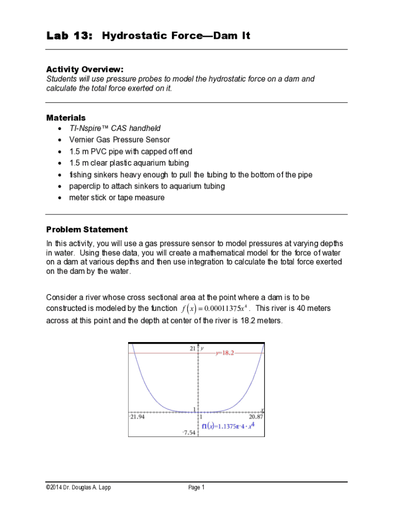 Lab 13: Hydrostatic Force Dam It Activity Overview: Students will use pressure probes to model the hydrostatic force on a dam and calculate the total force exerted on it. Materials Inspire CAS handheld