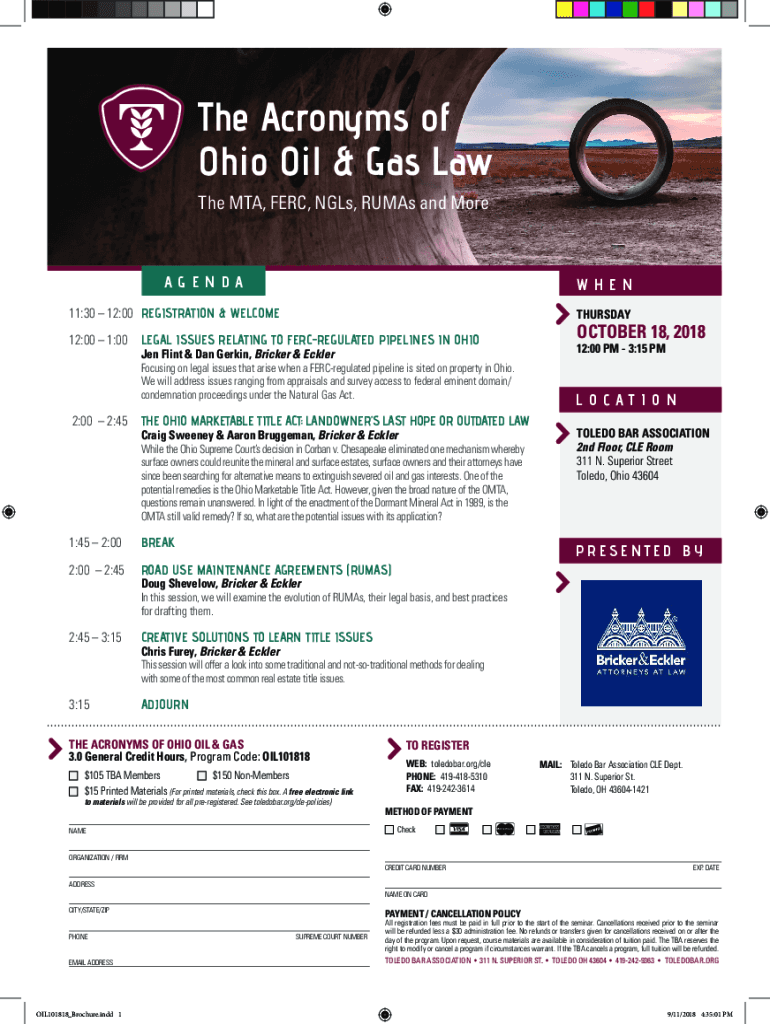 The Acronyms of Ohio Oil & Gas Law The MTA, FERC, GLS, Dumas and More AG E N DAWN E N11:30 12:00REGISTRATION & WELCOMETHURSDAYOCTOBER 18, 201812:00 1:00LEGAL ISSUES RELATING TO DEREGULATED PIPELINES
