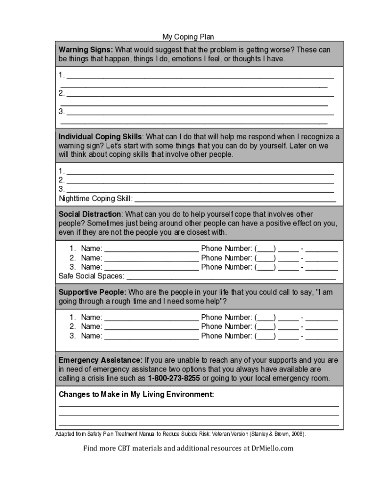 My Coping Plan Warning Signs: What would suggest that the problem is getting worse? These can be things that happen, things I do, emotions I feel, or thoughts I have.1. ___ ___ 2. ___ ___ 3. ___ ___