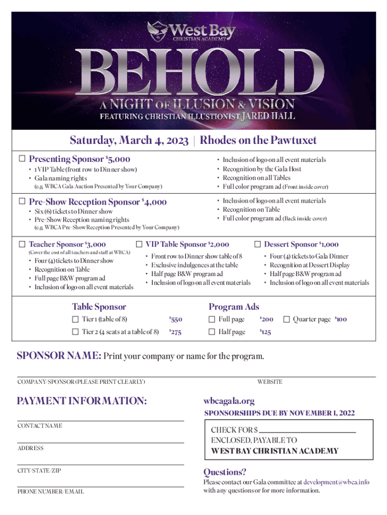 Saturday, March 4, 2023 | Rhodes on the Pawtucket Presenting Sponsor $5,0001 VIP Table (front row to Dinner show) Gala naming rights (e.g. BCA Gala Auction Presented by Your Company)PreShow Reception