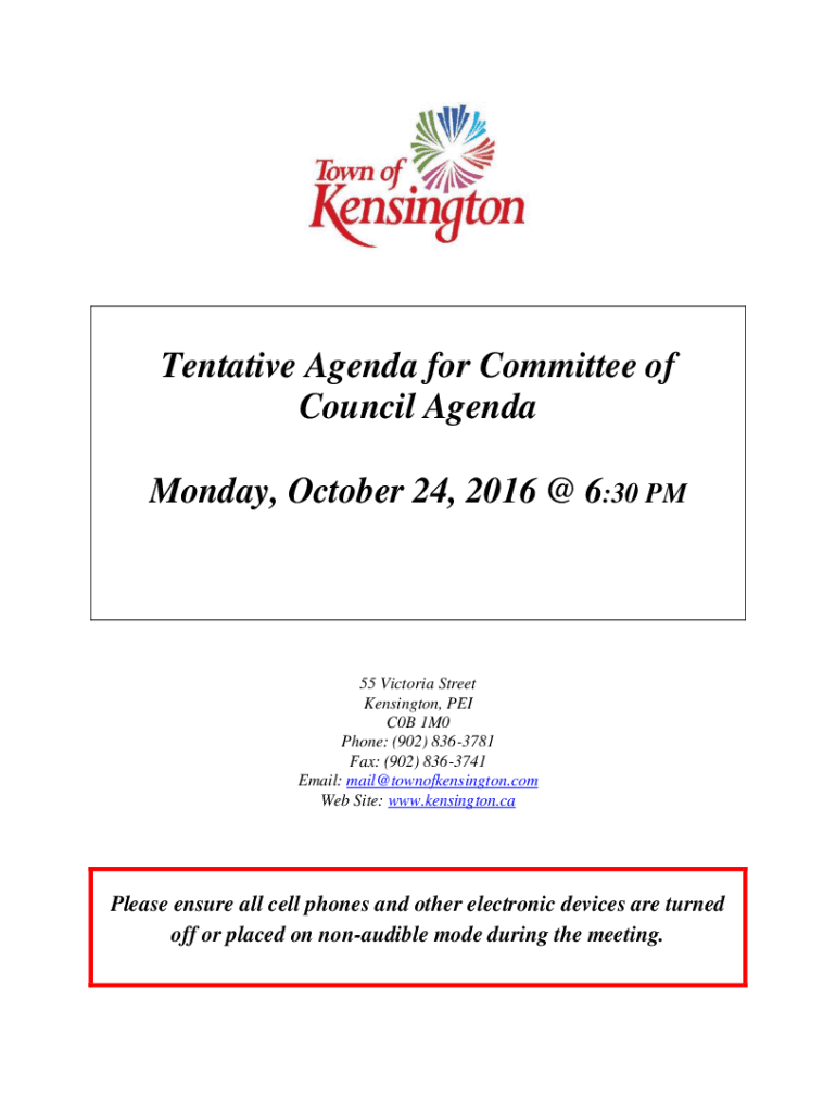Tentative Agenda for Committee of Council Agenda Monday, October 24, 2016 @ 6:30 PM55 Victoria Street Kensington, PEI C0B 1M0 Phone: (902) 8363781 Fax: (902) 8363741 Email: mail@townofkensington.com