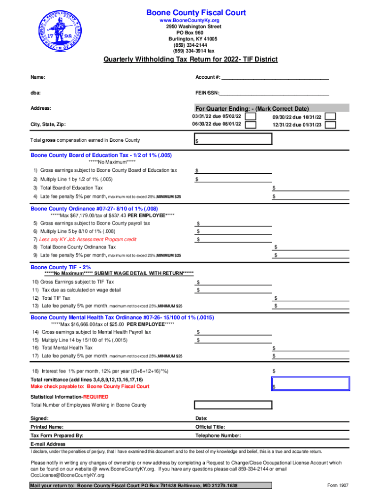 Boone County Fiscal Court www.BooneCountyKy.org 2950 Washington Street PO Box 960 Burlington, KY 41005 (859) 3342144 (859) 3343914 quarterly Withholding Tax Return for 2022 TIF District Name:Account