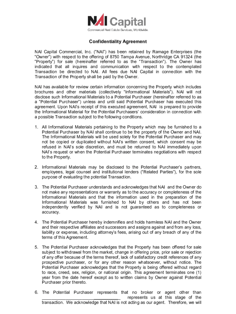 Confidentiality Agreement NAZI Capital Commercial, Inc. (NAZI) has been retained by Damage Enterprises (the Owner) with respect to the offering of 8750 Tampa Avenue, Northridge CA 91324 (the Property)