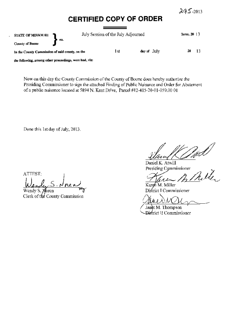 County of Booster. 20July Session of the July Adjourned13ea. In the County Commission of said county, on the1stday ofJuly2013the following, among other proceedings,