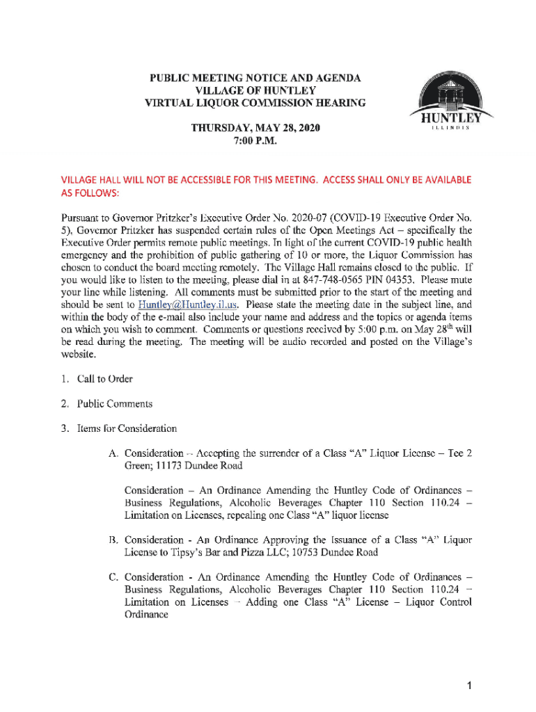 PUBLIC MEETING NOTICE AND AGENDA VILLAGE OF HUNTLEY VIRTUAL LIQUOR COMMISSION HEARING THURSDAY, MAY 28, 2020 7:00P. M.ILLINOISVILLAGE HALL WILL NOT BE ACCESSIBLE FOR THIS MEETING. ACCESS SHALL ONLY