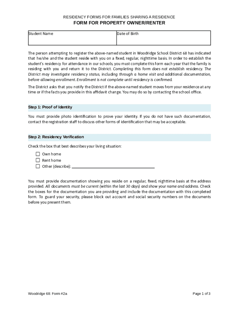 RESIDENCY FORMS FOR FAMILIES SHARING A RESIDENCEFORM FOR PROPERTY OWNER/RENTER Student Name Date of Birth person attempting to register the above named student in Woodridge School District 68 has