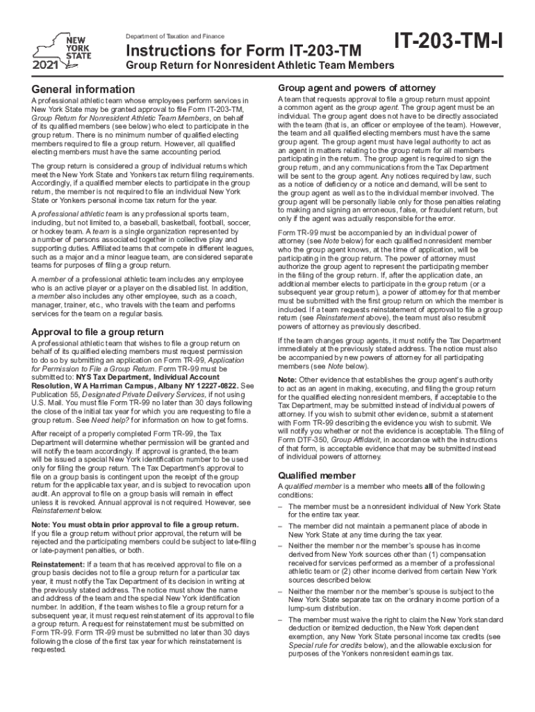 Department of Taxation and FinanceInstructions for Form IT203TMIT203TMIGroup Return for Nonresident Athletic Team MembersGeneral information professional athletic team whose employees perform services