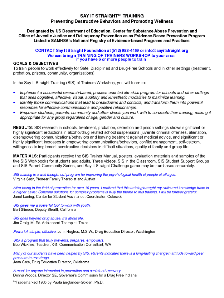 SAY IT Straight TRAINING Preventing Destructive Behaviors and Promoting Wellness Designated by US Department of Education, Center for Substance Abuse Prevention and Office of Juvenile Justice and