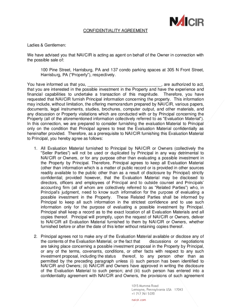 CONFIDENTIALITY AGREEMENTLadies & Gentlemen: We have advised you that NAZI/CIR is acting as agent on behalf of the Owner in connection with the possible sale of: 100 Pine Street, Harrisburg, PA and