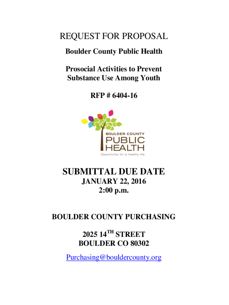 REQUEST FOR PROPOSAL Boulder County Public Health Prosocial Activities to Prevent Substance Use Among Youth RFP # 640416SUBMITTAL DUE DATE JANUARY 22, 2016 2:00 p.m.BOULDER COUNTY PURCHASING 2025